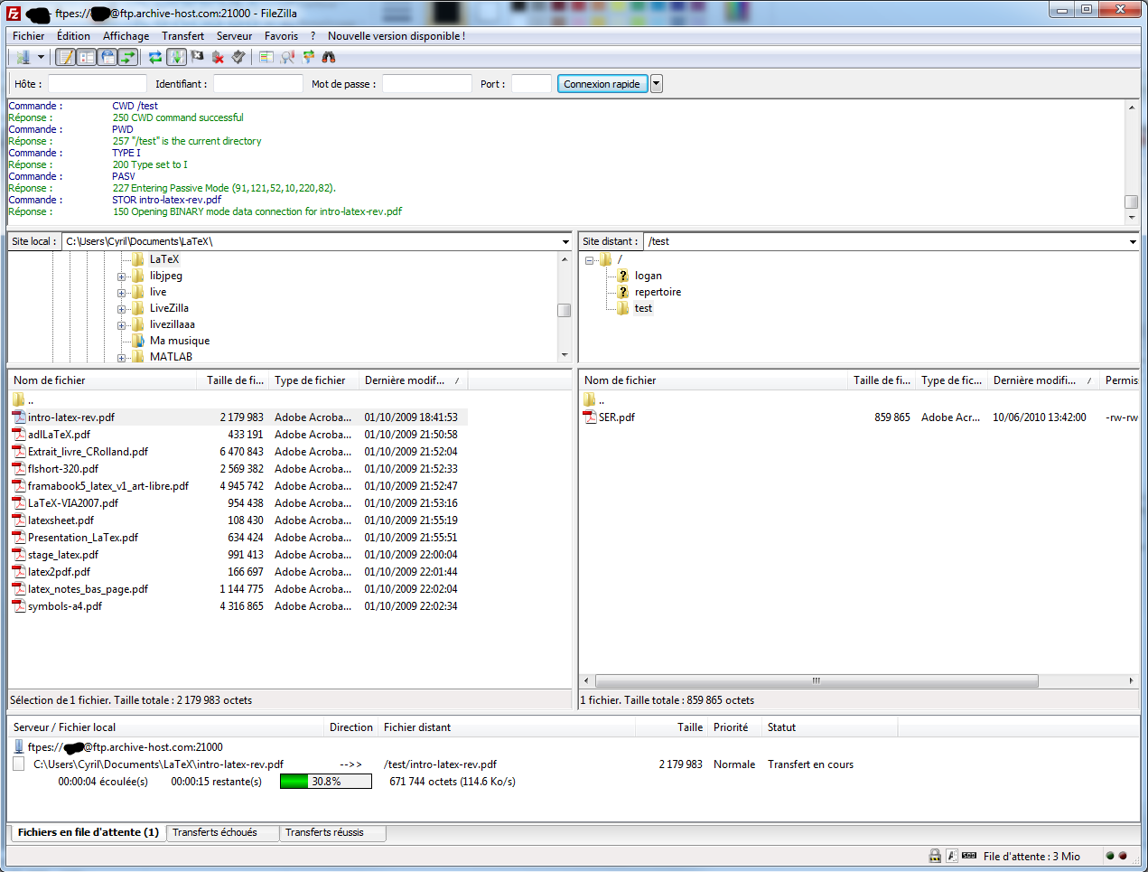 Le FTP (Files Transfer Protocol ou Protocole de Transfert de Fichiers) vous permet de transférer simplement vos fichiers vers le dossier "Mes Fichiers FTP". Ce dossier est à part de votre compte, non accessible directement depuis Internet. Vous pouvez ajouter dans ce dossier tous vos documents, peu importe son type et sa taille (dans la limite de votre espace disque). Vous pouvez envoyer des centaines de fichiers sans problèmes, des dossiers, des arborescences. Le FTP permet de faire des pause et de reprendre les transferts et gère les coupures de connexion le tout avec barre de chargement, temps restants et vitesse d'envoi.